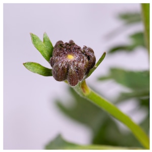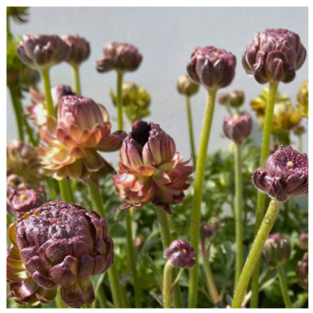 咲き始めはボール型、続いて菊咲き、次に黒赤色の芯部が現れる個性派ラナンキュラス。